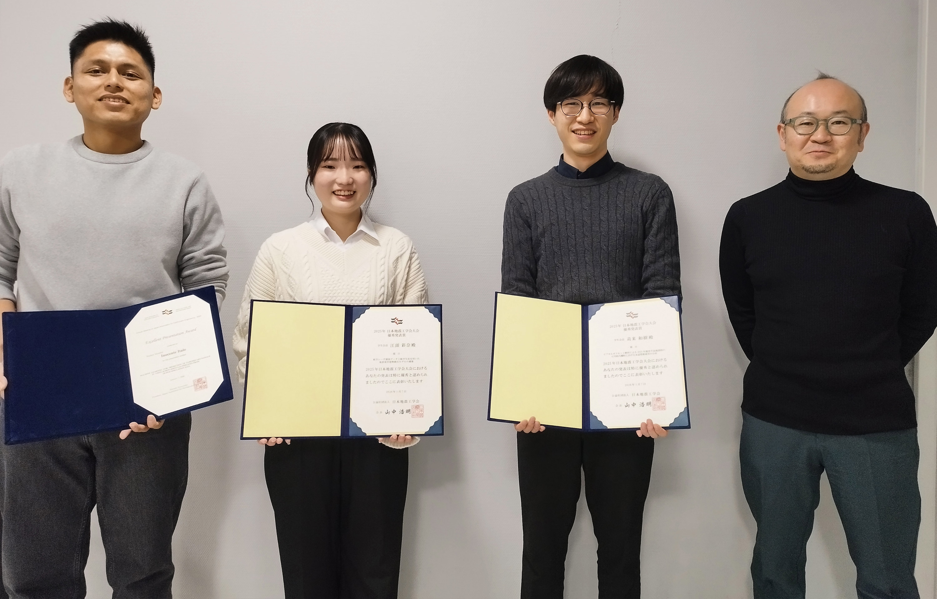 日本地震工学会・大会-2025にて、丸山研究室の苅米和樹くん(D2)、Inocente Italoくん(D2)、江頭彩奈さん(M2)が優秀発表賞を受賞しました。
